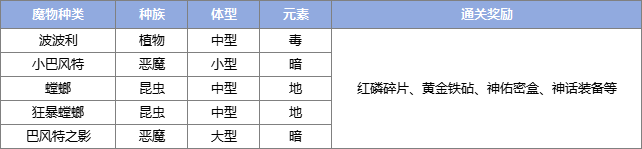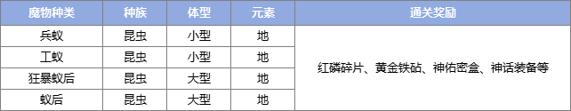 攻略篇丨团队副本,详细介绍团队副本无疑是初心者们获取神话装备的途径之一,不仅考验着玩家的实力,更考验着各职业的搭配与协作。团队副本可多人参与,至多5人,每周一、周五凌晨五点刷新。一起来看看哪些挑战和奖励吧~ △攻略仅供参考△ 01 再探蚁洞(等级要求50级,推荐团队战力30W) 地图描述:食人蚁曾经是灾难之中高威胁的魔物军种之一,所到之处所有生命都会被它们吞噬。尽管如今它们已经被赶回地下蚁穴,但依旧无人敢踏入食人蚁的领地。毕竟端坐在蚁六深处的蚁后永远饥饿,永远需要食物。 ![]()