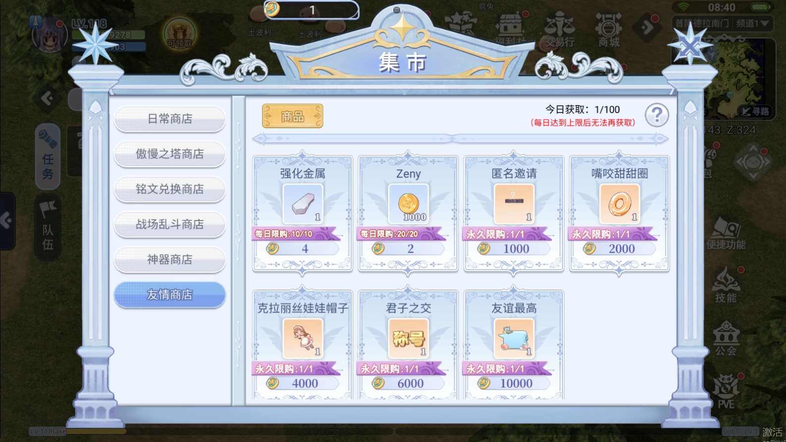 友情商店物品详情 玩家可通过「集市」进入「友情商店」兑换各种物品,包括强化金属、金币、时装头饰、称号、聊天气泡框等。 ![]()